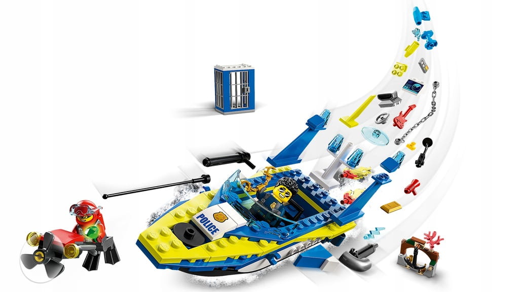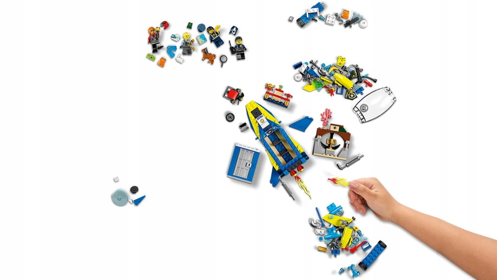 - Mnóstwo akcesoriów do wykonywania misji — akcesoria dla minifigurek obejmują sprzęt do nurkowania, szkło powiększające, kamizelkę ratunkową, krótkofalówkę, lornetkę, kajdanki, aparat i skarb