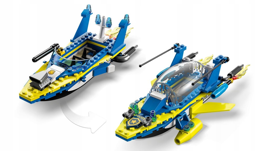 - Co jest w pudełku? — wszystko, czego dzieci potrzebują do zbudowania motorówki i wykonania niewymagających instrukcji wyzwań. W komplecie są też cztery minifigurki, w tym Duke DeTain z serialu LEGO® City